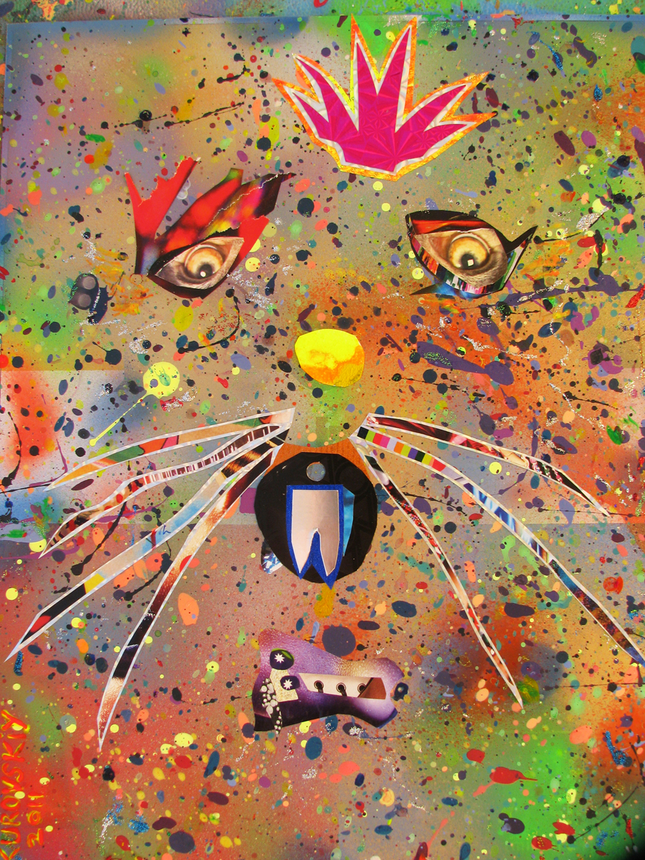mixed media: acrylic, fluor spray, gel, paper collage