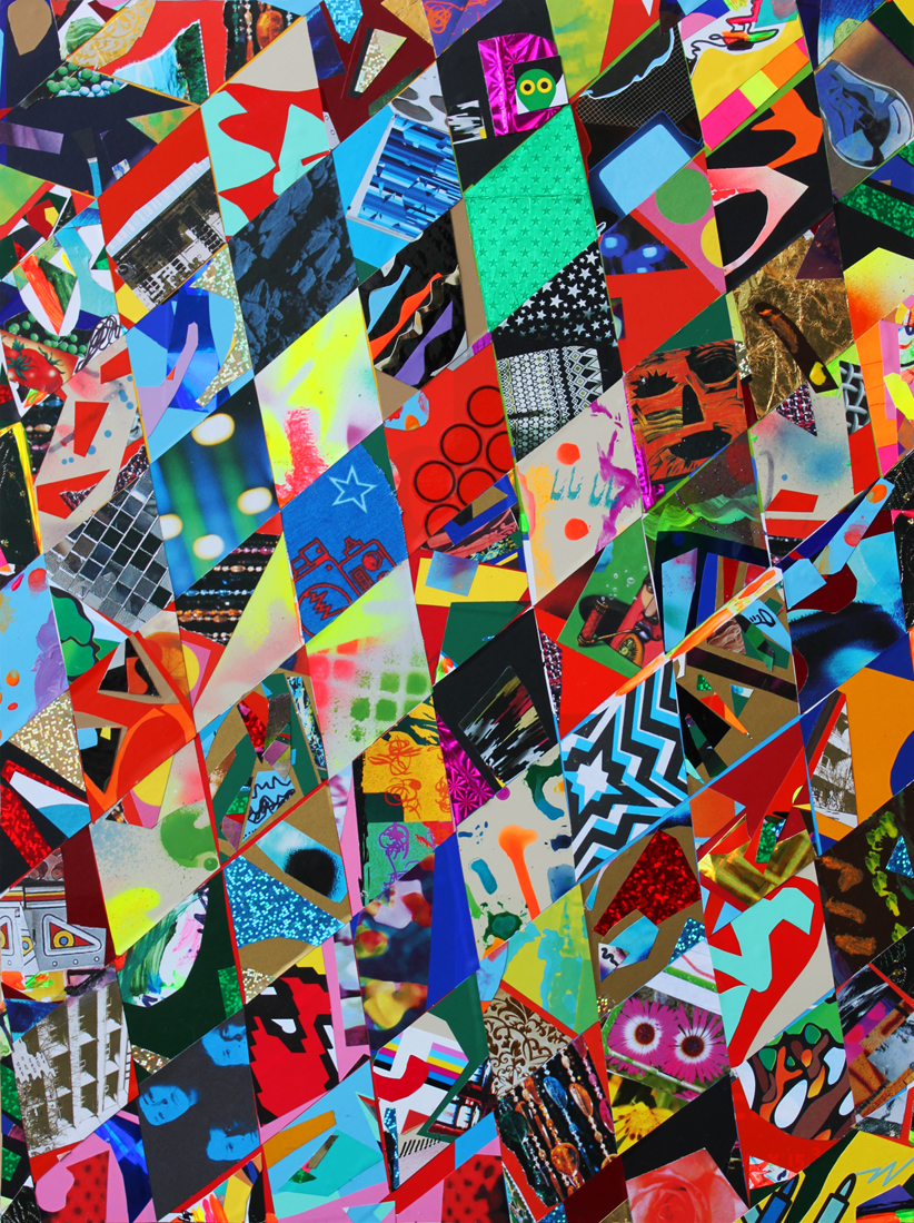mixed media: acrylic, oracal, markers, shiny gel, fluor spray, paper collage, etc