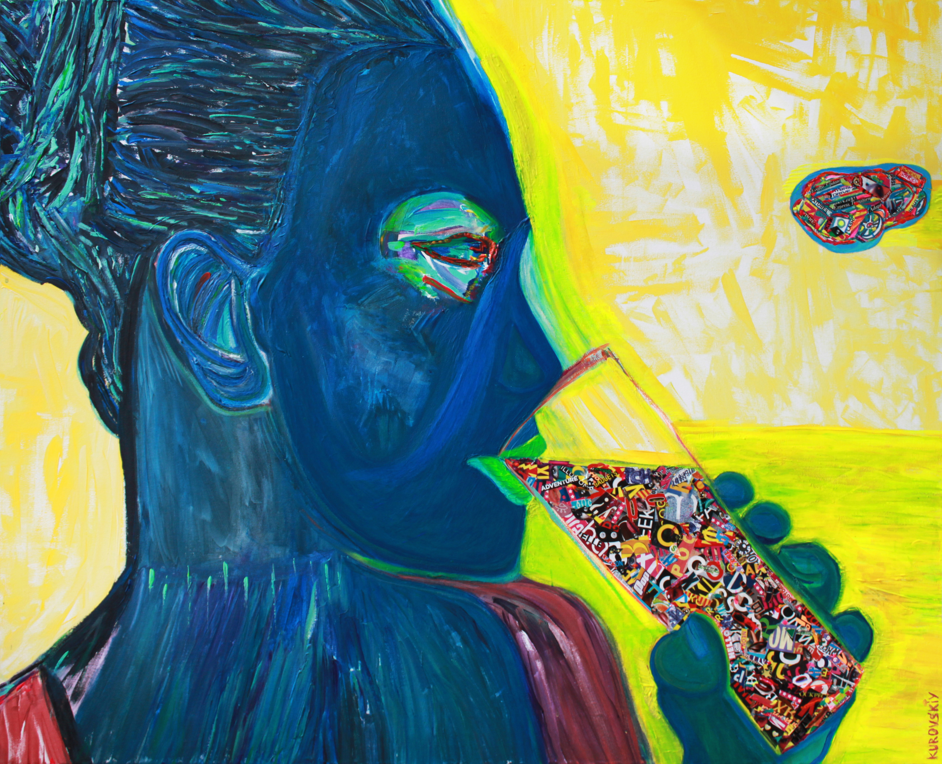mixed media: acrylic, metallic gel, paper collage on canvas